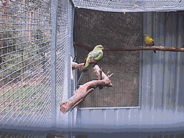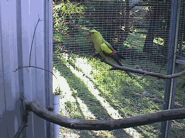 I used to keep my birds in a 3 x 2.4 x 1.8m aviary. I decided that this did not allow as much flying space as they needed so I moved them into a 4.5 x 1.35 x 2.1m next to my Princess parrots. These birds are very active and fly up and down all the time so the extra room is good. The floor is just dirt with a thick covering of eucalypt mulch. I have PVC pipe pieces I the corners that are filled with Gum branches as well as wattle and grevillia branches. They love chewing these and eating any buds or flowers.